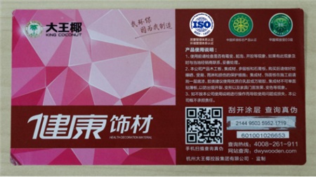 每张大王椰的板材上面都会有一张防伪标签,具体标签如下:
