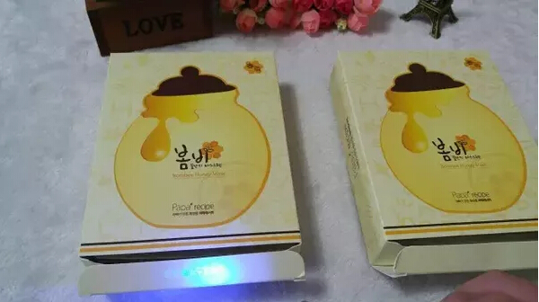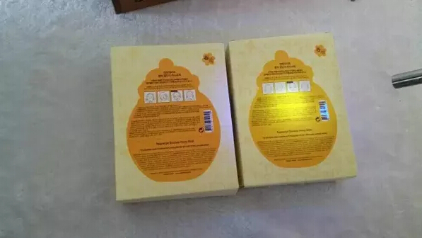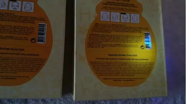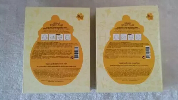 6、撕开包装观察,假货开口不平整,真货较平整易撕开。打开包装取出面膜,正品较为平整,质地较厚,假货感觉质地薄一些,做工稍差,从气味上还是比较好区分的,正品是淡淡香甜的蜂蜜味道,无刺激性气味,假货则是比较重的香精味(假货一般用香精调制,所以普遍假面膜都会特别香)。(左侧假货,右侧正品)