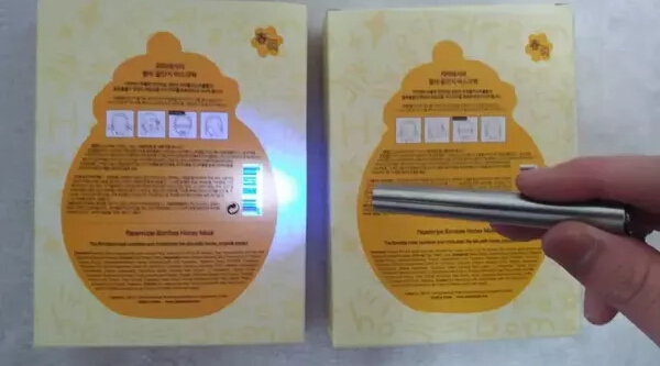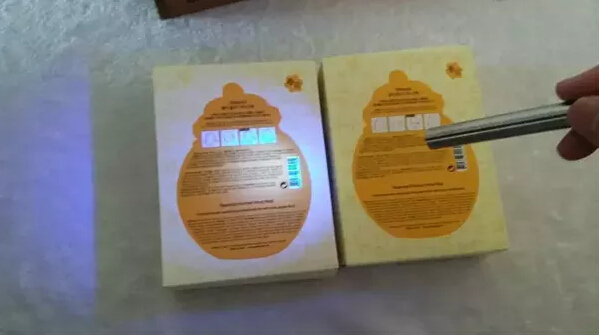 4、在包装底部打上紫光仔细观察可见,假货正品字样清晰,真货字体周围有朦胧感。且假货盒子周围都散发紫光,真货照到盒子上为白光。(左侧假货,右侧正品)