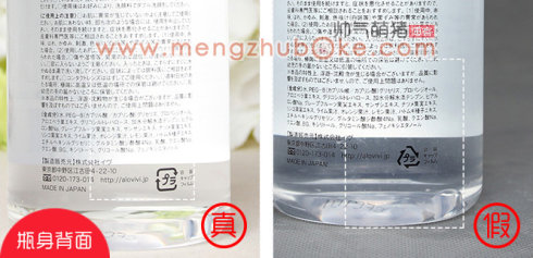 这是瓶身背面的对比,正品瓶身背面的回收标志是正方形的,且线条很粗,而假货的该回收图案却是三角形的,大家要多细心看,不然会看走眼的。