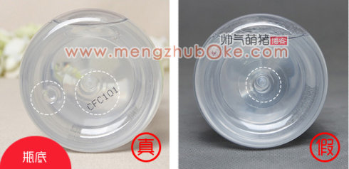 瓶底部分,至少有两个区别,上面我已经加了圈标注了。正品的瓶底有一个凹进去的小圆孔,中间还有产品编码。而假货的瓶底除了中间那个凸点其他什么都没有。