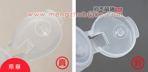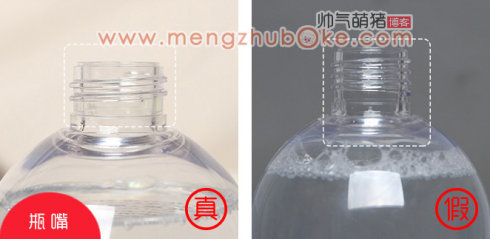 瓶嘴部分对比也有区别,对比一下可以看到正品跟假货的区别。正品的瓶嘴螺旋齿只有两圈,而假货的瓶嘴的螺旋齿却有三圈。所以假货的瓶嘴比正品的高一些。