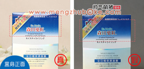 这个区别是理所当然的了,假货都是做贼心虚嘛,所以盒装包装并没有贴任何的防伪标签。当然今天对比这件是粗仿级,有的做假的会连官方真伪查询网站都仿造,那就是另当别论了,但目前萌猪还没有发现森田药妆面膜的假货中做到这一级别的。正品盒身侧面是贴有贴有涂层二维码,刮开涂层,直接用手机扫描其二维码即可验证真伪。