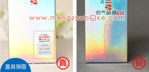 在对比盒身正面的时候,这是萌猪的第一个发现。正品的盒装包装是有一条很长的易拆线,沿着盒子上的虚线就可以轻易打开盒子,就像抽取式的纸巾一样,这是一个贴心的设计。而假货的盒子包装却是没有这道设计工序,真是能省则省啊!