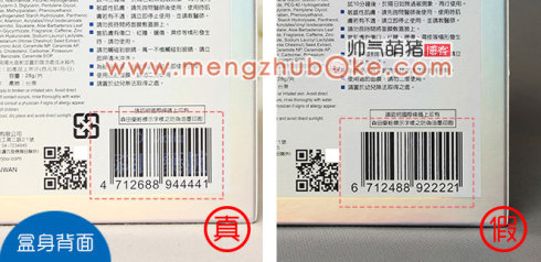 上面的对比图也不知大家能否看清楚,拍出来转在电脑屏幕上似乎对比就不明显了……但实际在手上时这个区别是挺明显的。仔细观察盒身背面的条形码。正品的条形码隐约可以看到“森田药妆”(注意实际包装上繁体字,萌猪的电脑没这个字库打不出繁体的)四个字。而假货的条形码是没有这四个字,就单纯的条码而于。