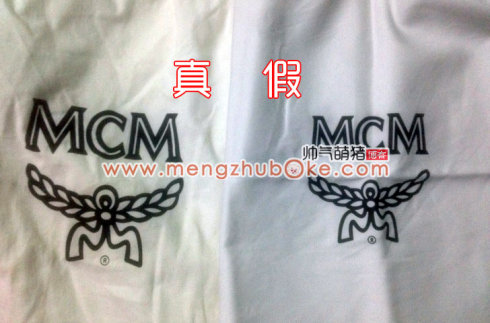 真假货都配备了防尘袋子,说明这次的假包还是算得了精仿级别的,但就是这个防尘袋子,假货也有破绽出来,大家看主要有两点,一个是袋子的颜色上,左边的正品防尘袋没有右边的假货防尘袋子那么白,具体讲正品是类似于乳色,略带一点黄,而假货的就是100%的白色了;另一个区别就在MCM的logo上了,整体看似乎仿的不错,但细心看无论是字体还是线条粗细上都与正品有区别的。