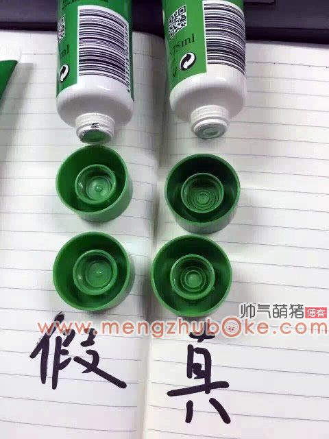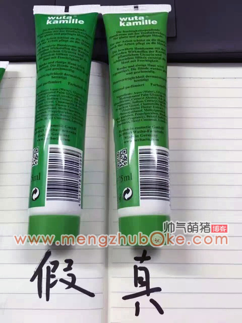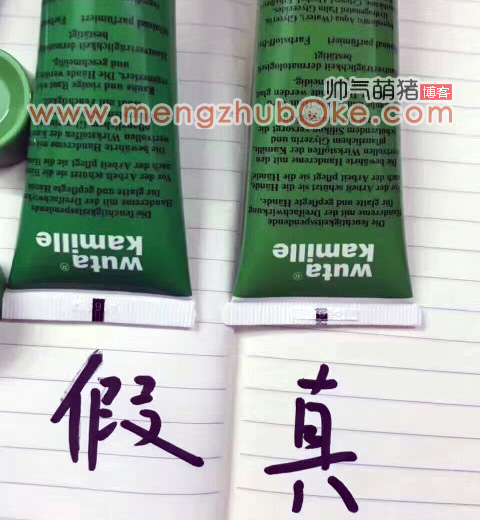 先说颜色的不同,单看假货的管体似乎没什么问题,但与正品一比区别就来了,真小甘菊护手霜管体的颜色为绿中带黄的,而假货的管体颜色为深绿,没有黄色成份的。再说上面的说明文字,假货的这些说明文字真的比正品的模糊太多,有些都出现重影了。