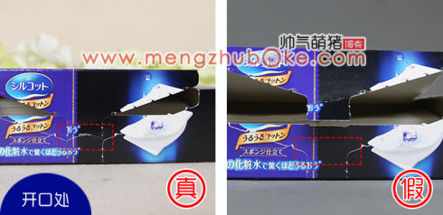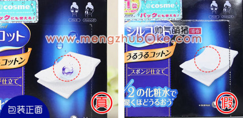 正品包装正面的“化妆棉”图案上面有水滴在上面漂浮。而假货的“化妆棉”图案是没有水滴的。在类似这些包装的图案上,假货们总是会出现问题的。
