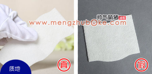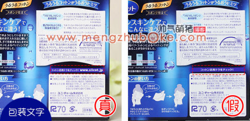 对比正品与假货的化妆棉质地,正品的比较有蓬松度,质地柔软吸水性也比较好。而假货的比较轻薄,质地粗糙,颤色也偏黄。实际上了点水试用了一下,发现正品的尤妮佳化妆棉,确实有节水功能,只需平时的一半,吸水后会变软,可以充分的释放化妆水,跟普通的化妆棉比较更为省水!而假货的化妆棉与日常使用的吸水纸类似,很浪费化妆水。