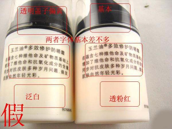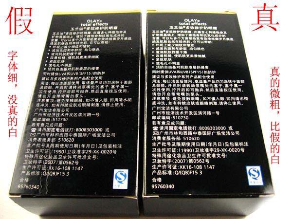 真玉兰油包装上是汉字印刷,而一些假玉兰油用的是英文,于是,很多假货卖家都会狡辩说这是英文版的是,是原装进口的,其实这就是假的。近期又了现有一种情况,就是在全英文之上贴了一张繁体中文的纸片,而卖家宣传这是水货,走私过来的,所以包装不同。亲们,有那么无聊吗,要把水货和正品的包装生产得不同?
