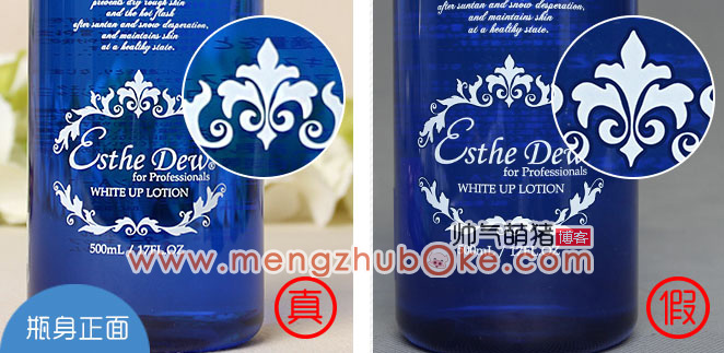 上图是对瓶子正面的花朵纹理图案相同位置进行扫描后发现的问题,这个因为瓶子本身颜色的问题,要细心才能发觉不同点。对比下正品与假货的瓶身正面的花圈图案,假货的花圈图案是有描上一层深蓝色描边的,而正品的图案是白色无描边的。