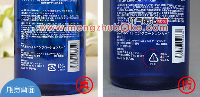 翻过来看瓶子背面的这些说明文字,文字部分附了假货的部分区域文字显得模糊这外,最大的区别恐怕就是上图中萌猪加了标注的这个标识了,这是环保标记图案,正品瓶身背面的回收标志是正方形的,且线条很粗,而假货的该回收图案却是三角形的,且线条比较细。