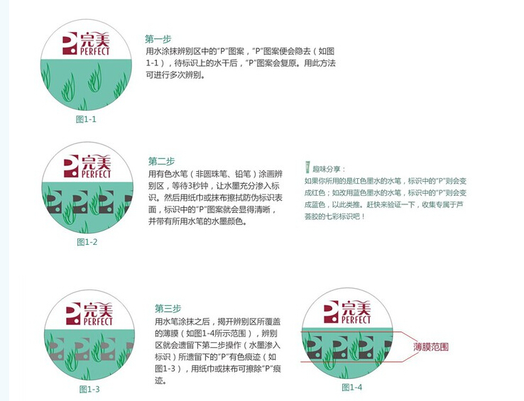 由于假货比较多,所以正品在2012年又增加了新的防伪标识,该防伪标识的辨别方法可以分成三步,第一步用水辨别区中的“P”图案,图案便会隐去,如图1-1。如果水干之后“P”图案会复原;第二步用有色水笔涂画辨别区,当然圆珠笔和铅笔除外。等待3秒后,水墨完全渗入标识,用纸巾擦干后,表面的“P”图案就会显现出来并且颜色是有变化的,如图1-2。如果我们用红颜色的墨水水笔,标识中的“P”则会是红的;如果是蓝色的墨水则“P”是蓝色的,依次类推,我想大家都应该明白了吧;第三步用水笔涂抹之后,揭开辨别区处的薄膜,辨别区就会留下第二步操作后的“P”图案,如图1-3。而且用纸巾或者摸布都可以擦除“P”痕迹。