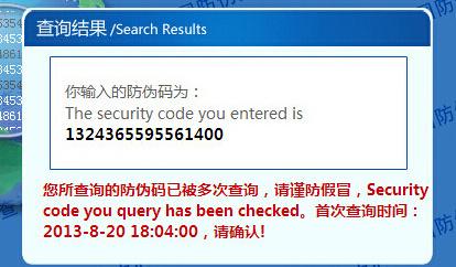 那么我们通常所说的产品防伪码造假是怎么一回事呢?实际上就是不法分子利用极少数防伪码进行一码多印。比如说他们通过各种渠道得到一个产品的防伪码,批量重印,相同的防伪码可能印刷数十万张标签。虽然这种防伪码造假的情况我们不可以制止和杜绝,但是作为消费者来讲我们还是可以辨别的。