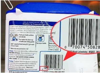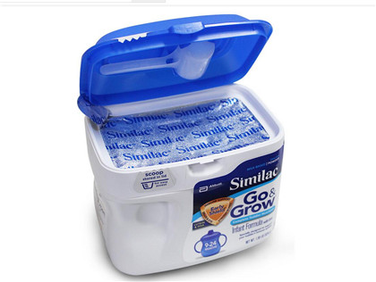 左上角会有一个银色封口标。早期批次在上面写有"SCOOP stored in lid,for easy access"(奶粉勺藏于盖子内,方便拿取)。但自从9月份美国雅培甲虫污染事件后(雅培奶粉召回事件专区),新生产的雅培奶粉封口处标注"NEWLY PRODUCED made after Oct 10"(新品,2010年10月后生产)。