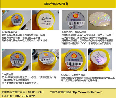 6、第二层的标贴在紫外线灯照射下出现红色“SHELL”字样。目前壳牌润滑油仅4L及以上容量包装红、黄、蓝、灰有电话防伪查询,所有1L装机油产品均无防伪查询。