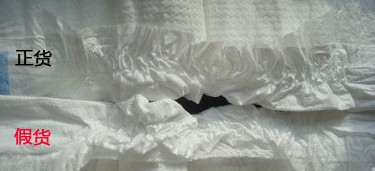 同样是相同型号的两片花王纸尿裤,我们来比较它们的防漏隔边,上面那片是正品的花王纸尿裤,防漏隔边由两根橡皮筋固定,编织得很整齐,而下面那片是假冒的“花王纸尿裤”,织法混乱,固定的橡皮筋也参差不齐,宝宝穿上后,一来不舒适,容易刮伤大腿,二来也容易侧漏。