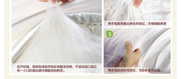 正规的被品,在产品都应该有标签标记品名、规格型号、材料成分、厂名厂址等相关信息。纯正的桑蚕丝或柞蚕丝的填充物标记为100%桑蚕丝/柞蚕丝,但是像短纤维蚕丝被这种的标记是100%蚕丝或纯天然100%桑蚕丝等。