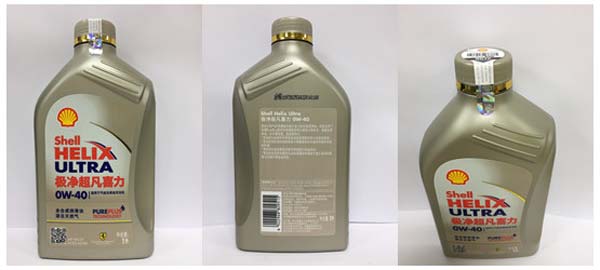 壳牌“多层次解决方案”防伪将防伪标识与封口签合二为一,双管齐下,包含四项防伪鉴别手段:在变色区域,查看标签黑三角形区域/底部圆弧区域,随着观察角度的不同,颜色会有绿灰互变;查看标签黑色色块区域,数码应与12位条码后四位保持一致,使用水性液体涂抹在白色数码表面,数码即会变成红色,干燥后颜色恢复原样;在标签尾部/顶部银色区域,是Shell个性化定制的全息技术,四个角度将观察到不同的Shell定制图案,三维立体壳牌标识效果,多语言文字底纹,呈现多彩衍射效果。