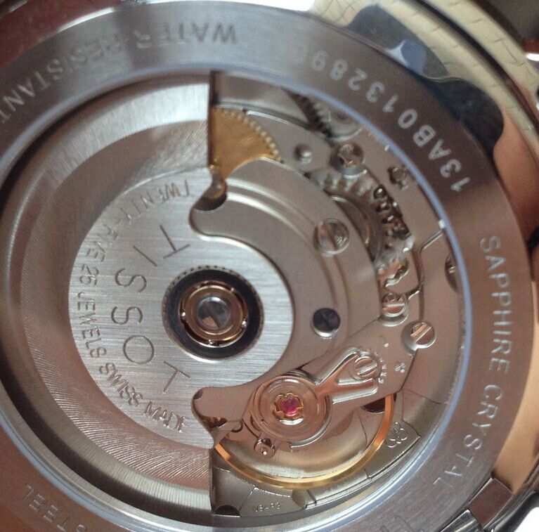正牌天梭手表商标机心内的夹板或摆铊上标有天梭商标标牌字样。机心在表壳组件中稳固,机心内清洁。假冒天梭手表机心内的夹板或摆铊上无天梭商标标牌字样,或天梭商标标牌字迹粗糙、模糊、歪斜、或简单地用小铜片粘贴。机心内不清洁,有些机心内有铜屑、头发丝、指纹等。